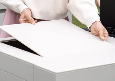 De kookzone van Nojara, met haar imposante Obsidian-structuur en het MDi Pacific Gris-werkblad, vormt een perfect samenspel met de centrale tafel. Hier versmelten elegantie en gastvrijheid: Obsidian en Sienna, gecombineerd met Pacific Gris-oppervlakken, zorgen voor een vloeiende visuele harmonie, terwijl Material Silk en Ancient Sage een subtiel contrast creëren met Pacific Blanco-bladen — een boeiende samensmelting van stijl en convivialiteit.